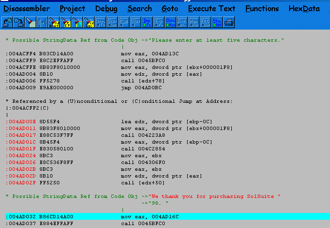 Ouvrez : Disassembler ----> Open file to disassemble --->Selectionnez Solsuite : exe dans le répertoire Solsuite -----> valider . . . le désassemblage commence .