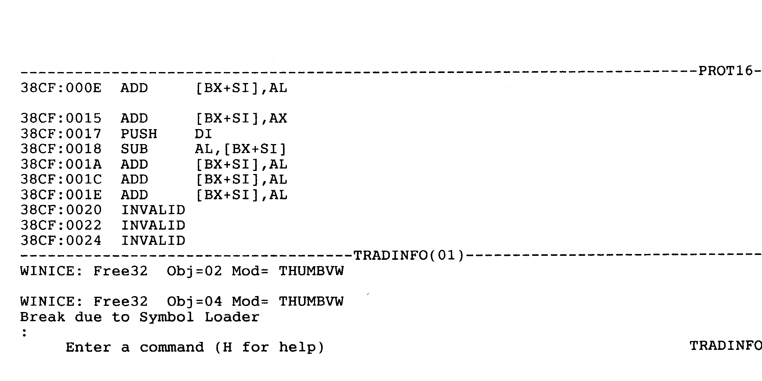 E + adresse ( ex : e 38CF:0015 ) vous affiche le contenu de l'adresse spécifiée.(en