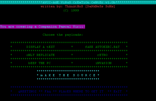 Simple, generic virus creation kit that produces Pascal companion viruses. Several user selectable features are available. A beta of a 32-bit version has been released as AVCC32.