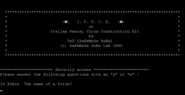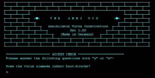 Like a few others this kit asks annoying "virus knowledge" questions as "access control". It looks very similar to AWVCK (it uses the same access control questions and has a similar look) but the differences could indicate that the product is from the same author and probably is not a hack or clone. The demo virus that is distributed with the kit scans as a VCS variant with F-Prot but as AVCS.270 with AVP.