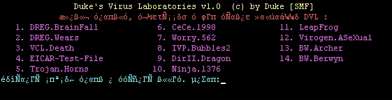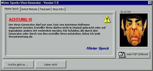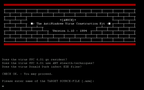 A virus creation kit that is distributed as "shareware", which is a novel idea since viruses can be considered the ultimate in "shareware". The kit asks annoying "virus knowledge" questions as "shareware nags" and "access control".