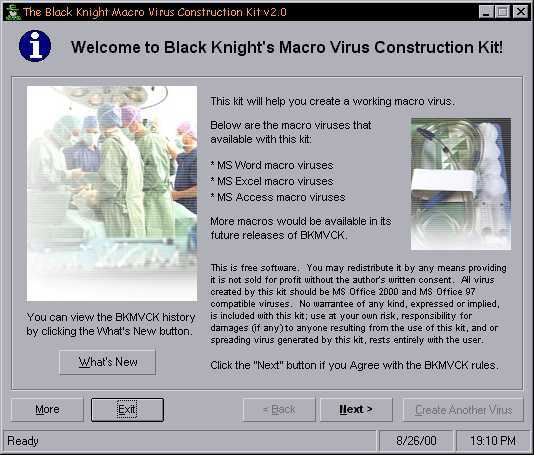 BKMVCK 2.0 - August 2000A macro virus creation kit with many similarities to LiME and other macro generators. Release 1.0 is created as a Word template (written using VBA) and has many user selectable payloads, infection settings, stealth settings, anti-virus techniques, triggers and miscellaneous features. For polymorphism it can use SOPS or APMRS. It creates Word 97 and Word 2000 compatible viruses. An early version is known as the Lucky Warrior Macro Virus Construction Kit (LWMVCK).