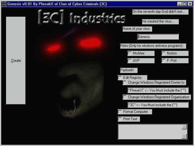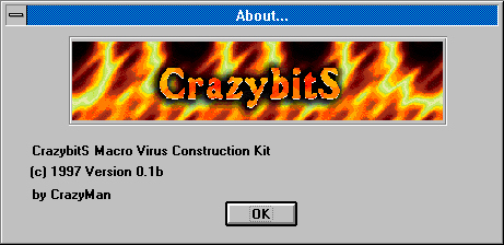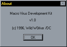 The first creation tool specifically aimed at making MS Word for Windows .DOC and .DOT macro viruses. Released as a .DOC file it basically is a macro to create macro viruses. The final 1.0 release has several more payload features than the beta version.