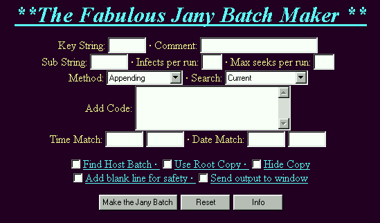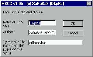This is a hacked version of release 0.02d of SBVM by Duke. Some dialogs were changed but remain similar to the original dialogs. Like SBVM it creates a batch virus.