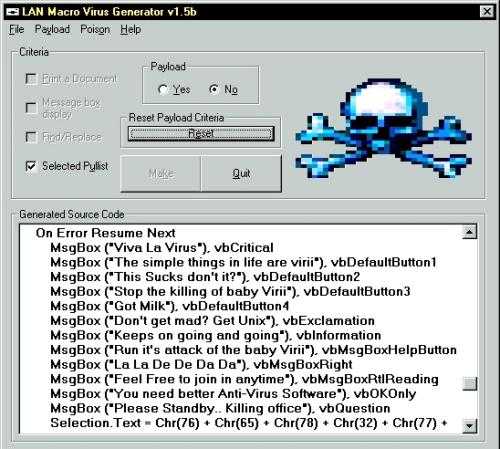 Word macro virus generator with several user selectable features (infection methods, payloads)