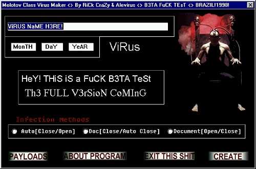 A Brasilian hack of the Dark Chasm's macro virus generation kit (DMVCK) this template for Word 97 creates Word 97 compatible viruses. Also released the Molotov Class Virus Maker (MCVM).