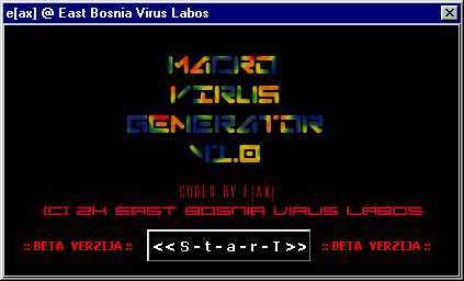 One of many this tool generates macro viruses for Microsoft Word. It has many user selectable features but all selections are displayed using the Yugoslav language. The program will support use of OIE, and RCJ.