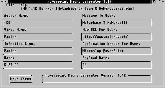 A DOS based virus generator for Powerpoint macro viruses. A limited number of user selectable features are available. By the creator of TSWSVK, SABV, WISK and WVSG. It was released with Metaphase Zine #2.