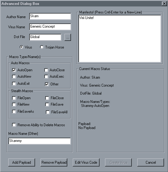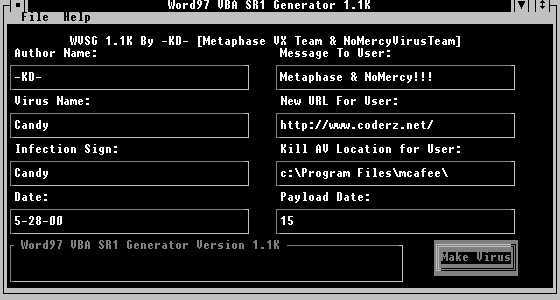 This macro virus generator is a predecessor to LiME and has multiple user selectable triggers, payloads and functions. It generates .BAS source codes and supports MS Word and MS Excel.