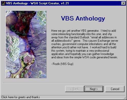 "WSHVGen is a small script generator -this version only for VBS- that allows you to make simple viruses that work in WSH. You need a net-browser that supports javascript to use it. WSHVGen is easy to use: Fill the following form to generate a new script. Note than Infection Sign must include only:- @ · # $ % | ª º ç ¦ * like symbols. The generated virus infects all VBS files in current directory. If not infects at least one file, then shows a payload (a popup message). Too simple, just to learn. "