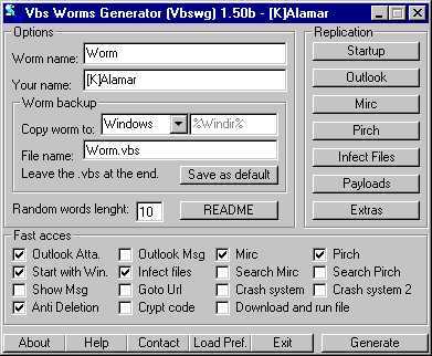 This is a "Simple" menu driven visual application for creating mIRC Worms. This program generates replicating mIRC Worm like programs from user-specified parameters. Basicly "EG. Fill in the Blank and press Make Worm" :-) Hopefully some one will get a copy of this and pick up a interest in programing HLL. New versions of mIRC do not support this type of worm at all only version 5.3x and before which use the same download dir as the mIRC program is located."