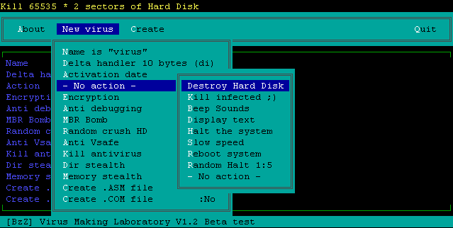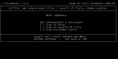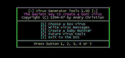 Hello! This is the first virus generator on the web. Do you want to have your own virus? Are you too lazy to learn assembler and write virus yourself? Are you afraid of downloading ms-dos virus generators? Never mind. I have created virus generator on the web for you. Just set virus parameters in your web browser and cgi-script on the server makes the virus for you. It's so easy. Then you can execute the virus on machine of somebody you don't like.