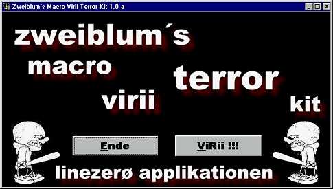 10 = Tremor - TremorThe generator generates essentially one and the same virus. The user is allowed only to change the message that gets appended to the printed documents and to select which one of the 10 possible DOS viruses is to be dropped by the macro virus. It generates infected Word documents.
