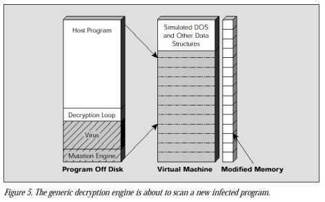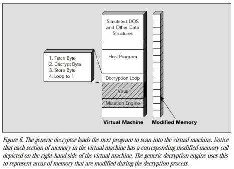 A scanner that uses generic decryption relies on this behavior to detect polymorphics. Each time it scans a new program file, it loads this file into a self-contained virtual computer created from RAM. Inside this virtual computer, program files execute as if running on a real computer.