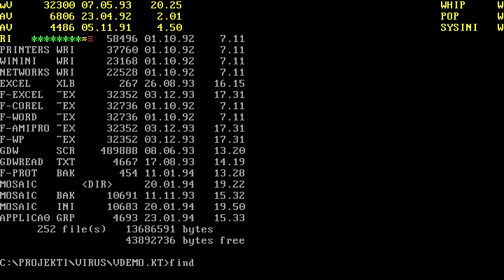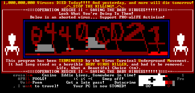 A more interesting display is produced by the Rescue virus, which shows a screen full of nonsense messages.