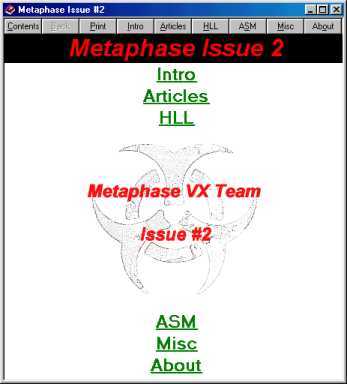 Contents: A virus oriented zine that contains several viruses and source codes, several interviews with well known VX figures as well as many articles. According to the editorial the zine is meant as a H/P/A/V oriented zine but the first issue is VX only oriented. The graphic user interface and layout are very well done and user friendly. This zine sets a standard on how things can be done with a some dedicated effort and know how. Issue #2 covered all virus related topics (interviews, tutorials, essays and virus code), was written using HTML and, just like issue #1, looked very professional. An online version of both can be found here [April 2000]].