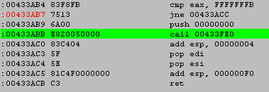 de código se accede desde un CALL en 00433ABB. Pues vamos de cabeza