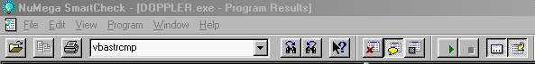 Es importante que tengais la barra de herramientas con los botones pulsados que se ven en la imagen, una vez cargado doppler.exe pulsamos la casilla start, inmediatamente se empieza a ejecutar nuestra victima pero ni se imagina que le estamos viendo las tripas. Si habeis configurado el SmartCheck como os sugeri, mientras se ejecuta el programa aparecera una ventana de error que dice asi