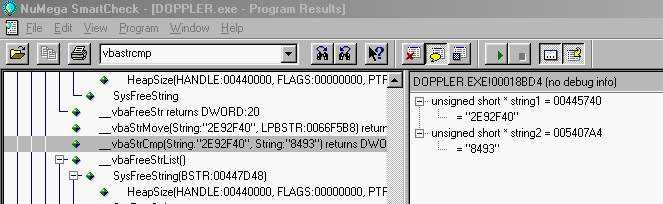 Bueno lo primero hacer una copia del ejecutable doppler.exe con el nombre por ejemplo doppler2.exe, desensamblamos doppler.exe con el W32dasm VB (el que muestra las String Ref. en Prog. visual basic) si no lo teneis lo podeis