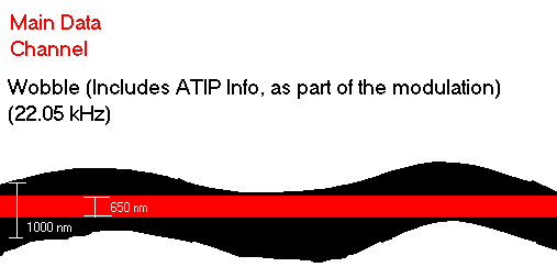 The ATIP (Absolute Time-In Pregroove), contains information about the blank CD. This information is required, so that the drive knows what kind of disc it is writing to, and so that it does not stray from the spiral it is supposed to write in.The Main Data Channel (The area in which data is actually written), is 650 nm wide, and is shown in red.