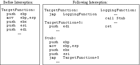 In this case, the API interceptor places a JMP instruction at the beginning of the target function, but not before saving the first 5 bytes of the function to a pre-allocated buffer in memory (a stub). The exact number of bytes to be copied to the stub may change depending on the instructions present at the head of the function. It cases where 5 bytes do not fall within instruction boundary, it is necessary to copy additional bytes until there is enough space for the JMP instruction to be inserted. Note that relative control-transfer instructions (i.e. JMPs and CALLs) need to be modified during copying to ensure that they transfer control to the right location in memory when executed from the stub. Obviously, performing such an analysis of assembly instructions requires the assistance of a disassembler, which, as I have mentioned before, is not very easy to implement.