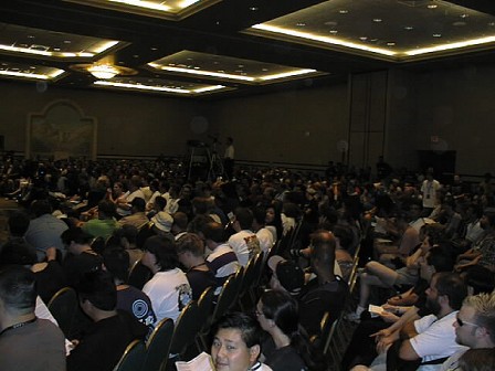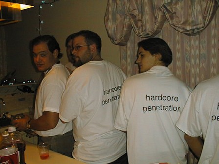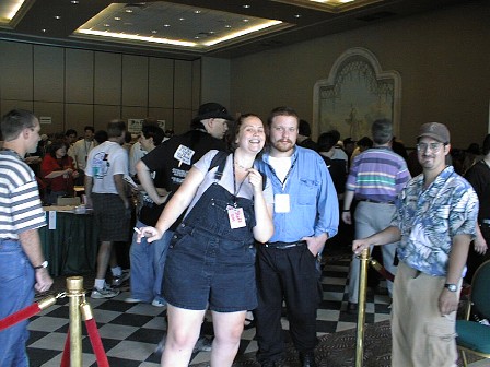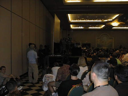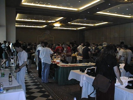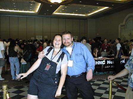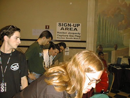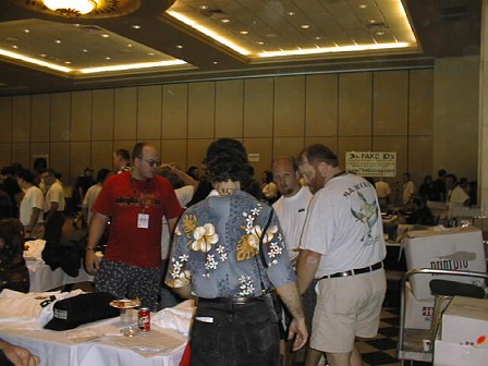 Defcon shirt sales area, (note fake id's in the background were pretty real looking). Guy in Red was voted most rude at the Strip-con later the next day. |