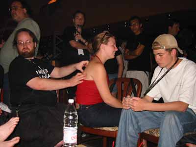 Here we see Steve massaging a friend of his (I hope). Bitrush patiently awaits his turn in the massage train.