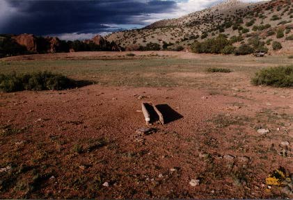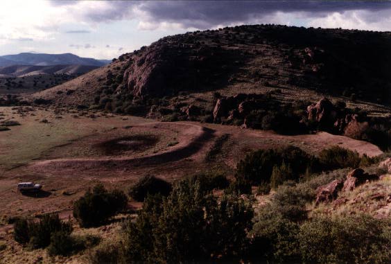 The road at milepoint 132.5 seems to close to Soccoro to match the description, while the one at 131.6 matched Hesemann's description and lead just where he said it would. This is a good road that any car should be able to handle except in wet weather. At the fork 0.4 from the highway, I went right; at 1.8, I went left. (Other routes lead to dead-ends or into mountains.) At 3.4 miles from the highway, I found it! Two adjacent cattle reservoirs appearing like the figure "8". This is in a scenic hollow which matches Hesemann's gateway-in-the-rocks description. The two reservoirs were in line with the drainage basis, apparently so the lower one would catch any overflow from the upper. Both were "dry" or more precisely thick mud churned by cattle hooves, and each was no more than 100 yards across. There were a lot of cattle tracks here, and there were also numerous car tracks. (They could have been from several cars or one car going back and forth; recent rains had obliterated the tread.) I found no sign of any discolored area except around an old salt trough where the cattle had gathered. [Photo, 28k] All the basin areas were all pretty trampled from the cattle and no surface traces would have remained there of an event almost 50 years ago (although the surrounding slopes might have been untouched). There was no way to be sure whether the reservoir had been in existence since 1947, but this is plausible since ranching has a long tradition in this area. The only thing of obvious interest in the area were some cattle bones.