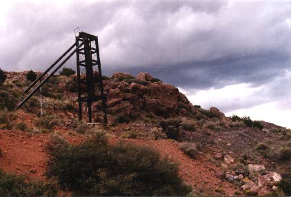 Returning to the first reservoir, I drove an unmaintained road downslope from the reservoir (through the "gateway") and found the remains of a significant mining operation, carving out a large part of a mountainside just out of view from the reservoir (about 1/4 mile). [Photo of some equipment, 28k] The state of decay of the equipment suggested that this mine could have been in operation in 1947--which would make this reservoir not remote at all from possible human witnesses.