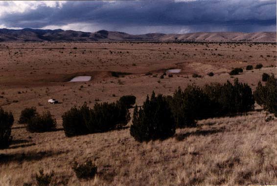 Although this area is "desert", it is a relatively lush one with evidence of significant rainfall. The ravines are deeply eroded, and the cattle reservoirs show signs of frequent maintenance-- newly deposited stones to repair the erosion of the overflow channels. Without active maintenance, the earthen dams would probably be too eroded to be useful after a few years. The terrain in this area covers a relative abrupt downward slope from the highlands at Magdalena (elevation about 6500 feet) to the Rio Grande basin (about 4500 feet). Given the rainfall and slope, this is not any area conducive to dry lakes, where run-off pools in a wide basinand then evaporates. A Magdalena resident also reports that he knows of no dry lakes in the area.