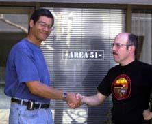 An historic meeting of the minds took place in March when Glenn Campbell of the Area 51 Research Center met Glenn Campbell of Area 51, the special effects house in Pasadena, Calif. The two have been confused with each other since Space: Above and Beyond hit the tube and Campbell's name and company appeared in the credits. Area 51 produces all of the computer generated spaceships, alien landscapes and deep space explosions for the show. Campbell is Special Effects Supervisor, acting as liason between the programmers in Pasadena and the production set.Campbell #1 and Campbell #2 have birthdays one day apart (plus a couple of years). The resemblance ends there, though. Campbell #2, by his own admission is "tall, dark and handsome" while Campbell #1 is pale and bald. (Some of the genes must have gotten mixed up back in Scotland.) The presence of both at "Area 51" appears to be pure coincidence. The founder of the company chose "Area 51" because it seemed sexy at the time, and Glenn Campbell was hired with no knowledge of the other.