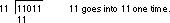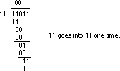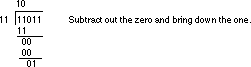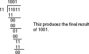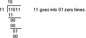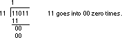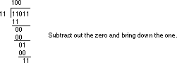 This algorithm is actually easier in binary since at each step you do not have to guess how many times 12 goes into the remainder nor do you have to multiply 12 by your guess to obtain the amount to subtract. At each step in the binary algorithm the divisor goes into the remainder exactly zero or one times. As an example, consider the division of 27 (11011) by three (11):