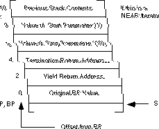 To begin with, an iterator will require two return addresses rather than the single return address you would normally expect. The first return address appearing on the stack is the termination return address. The second return address is where the subroutine transfers control on a yield operation. The calling code must push these two return addresses upon initial invocation of the iterator. The stack, upon initial entry into the iterator, should look something like this: