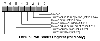 There are three I/O addresses associated with a typical PC compatible parallel port. These addresses belong to the data register, the status register, and the control register. The data register is an eight-bit read/write port. Reading the data register (in a unidirectional mode) returns the value last written to the data register. The control and status registers provide the interface to the other I/O lines. The organization of these ports is as follows: