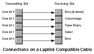 Data written on bits zero through three of the data register at the transmitting site appear, unchanged, on bits three through six of the status port on the receiving site. Bit four of the transmitting site appears, inverted, at bit seven of the receiving site. Note that Laplink compatible cables are bidirectional. That is, you can transmit data from either site to the other using the connections above. However, since there are only five input bits on the parallel port, you must transfer the data four bits at a time (we need one bit for the data strobe). Since the receiving site needs to acknowledge data transmissions, we cannot simultaneously transmit data in both directions. We must use one of the output lines at the site receiving data to acknowledge the incoming data.