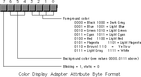 Display: array [0..24, 0..79] of word;Note that location (0,0) is the upper left hand corner and location (79,24) is the lower right hand corner of the display (the values in parentheses are the x and y coordinates, with the x/horizontal coordinate appearing first).