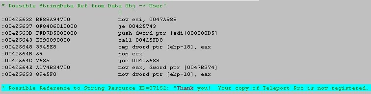 Eureka! I do believe we've found it!. Write down the code location of the line before the CMP statement. (i.e. 425643) (which is PROBABLY the call to the routine that calculates the serial number if you're interested in trying a keygen). Shut down W32Dasm, fire up Teleport Pro and set a bpx on CS:425643, (or, break on GetWindowTextA and step through using F10 until you get to this location). Try to register the program ..... SoftICE breaks.