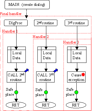 There is a modal dialog for the main window and the final handler is set up very early in the process. When the "Cause Exception" button is clicked, first the dialog procedure is called with the command, then 2 further routines are called, the third routine causing an exception of the type chosen by the radiobuttons. As execution passes through this code, 3 per-thread exception handlers are created.