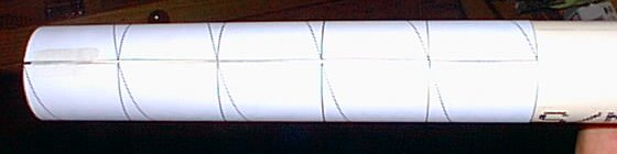 - Using a sharp point like a scribe, perforate the template along the helical line at regular intervals, say 5 or 6 per revolution. This will leave marks in the PVC you can follow when wrapping the wire around. Slide the template along in stages until you gave a complete spiral running the length of the tube. Mark the where the end of the spiral on the template finishes. You should have a few mm of tube left over. This is OK.