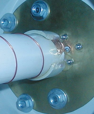 - Let the glue dry (about a day). Install on the U-bolts and you have yourself a helical! With the taper in place and everything glued up and bolted together you should have something looking like the picture below. You can see the N connector bolts and centre stub poking through the brass shim. Also visible is the taper corner soldered to the stub and everything covered in globs of dried Araldite.