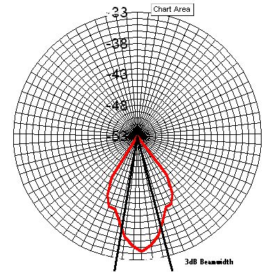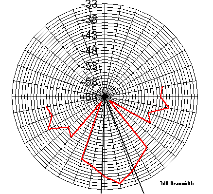 Below are some beam pattern measurements. Unfortunately due to the setup I was only able to measure the frontside 180 degrees. The first beam pattern was sampled at 5 degree intervals for 40 degrees and mirrored to give a full beam. The -3dB points as marked agree with the theory that the beam is about 25 degrees wide. The second beam patterns was coarser with 10 degree intervals used over 90 degrees. This clearly shows the first null at about 40 degrees off the boresight. The ratio between the main beam maximum and side lobe maximum was about 10dB. The front to back ratio was measured at 20dB.