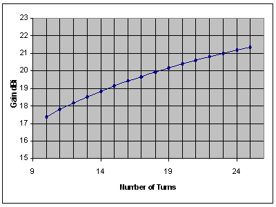 The chart below shows the amount of gain to be had for the number of turns. As you can see, to get about 3dB more you have to double the number of turns and double the length of the aerial. Thirteen turns happens to fit into 0.50m and is a good compromise for length versus gain.