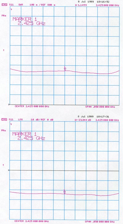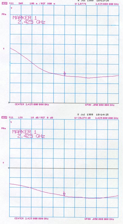 I have measured the efficiency of these aerials by measuring the S11 parameters. Below are measuremeants for both aerials I constructed. The upper diagram is the SWR measurement, and lower is the log return measurement. Both aerials are very good and have the broadband required for spread spectrum communications (SWR of 1:1.15 or better!). It would seem the ad-hoc aerial matching strip actually works extremely well! I have yet to test the performance over distance.