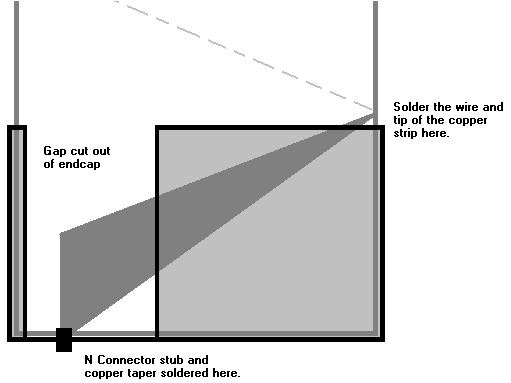 - Carefully solder the narrow pointy end of the tapered strip to the wire and match up where the lower corner at the large end will solder neatly onto the stub of the N connector. You might need to use glue or sticky tape to hold it in place. You might have to do some trimming to get the strip to the correct length. This strip in effect acts as an impedance transformer. I don't know quite how it works, but I've done it four times with each strip of slightly different lengths and according the to two-port analyser it works well.