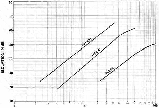 These curves are based on the use of half-wave dipole antennas. The curves will also provide acceptable results for gain type antennas if (1) the indicated isolation is reduced by the sum of the antenna gains and if (2) the spacing between the gain antennas is greater than 50 feet.