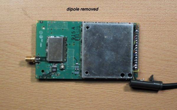 1. locate the dual integrated dipole antennas, desolder and remove. The foam blocks they sit upon just rip off with a little force. Go for it.Depending on your plastic widdling skillz, your finished modification should look like this, and this.2. Obtain a female 5-post(four ground, and center signal conductor) SMC PCB mount RF connector from your favorite RF connector source.