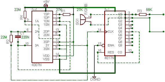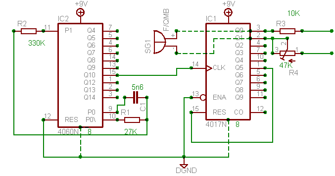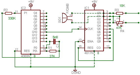 The component labelled SG1 F/QMB is a small piezo sounder disc. The whole point of these circuits is to absolutely minimize the power consumption of the active components on board. Whilst a LED in series with a 1K resistor could be driven by the Cd4017 IC, this would bump up the juice needed by a factor of 1000!!! A small disc piezo sounder costs around 30 cents, consumes virtually no current and sounds really beautiful!
