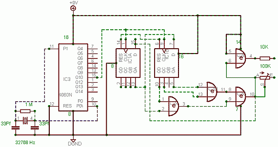 Basically a cheap watch Xtal is divided down to 32 Hz by a CD4060 and this is fed as a clock signal ito a CD4015 Serial to