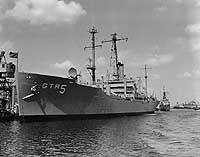 Photo #: K-39927 USS Liberty (AGTR-5) Underway in Chesapeake Bay, 29 July 1967, upon her return from the Mediterranean Sea. She had been attacked and seriously damaged by Israeli air and surface forces while operating off the Sinai Peninsula on 8 June 1967, during the "Six-Day War", and was subsequently repaired at Malta. Official U.S. Navy Photograph. Online Image: 111KB; 740 x 615 pixels Reproductions of this image may also be available through the National Archives photographic reproduction system as Photo # 428-K-39927. NOTE: Though reproductions of this photo from the Naval Historical Center's collections are available in black & white only, those from the National Archives should be available in color. | ![]() |