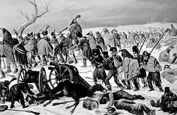 Napoleon's defeat in Russia: only 10,000 out of 422,000 French soldiers survived the campaign. Here Napoleon and his troops retreat under freezing conditions.